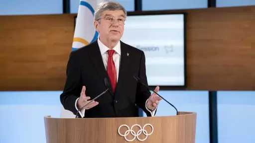 نسخة طبق الاصل من الميداليات الأوليمبية يتسلمها توماس باخ
